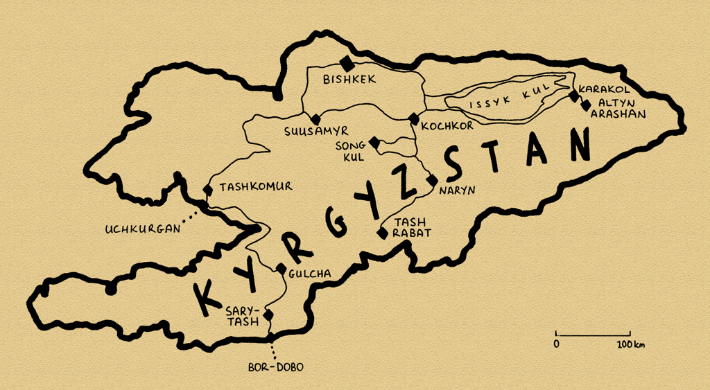 The road south crosses another dusty mountain pass, which is pounded by huge Chinese-made lorries ferrying goods either way across the border, a modern-day remnant of the ancient Siilk Road. Beyond the pass, the road draws up alongside the At Bashy range, a line of sharp, snowcapped peaks which run roughly parallel to the Chinese border. This is true big-sky country, with banks of windswept cloud creeping over the peaks from the east. Sadly, the Chinese government do not permit foreigners to freely drive around China, but it’s tantalising to be so close to Xinjiang, Chinese Turkestan, the place where I first encountered Central Asia in 2003.