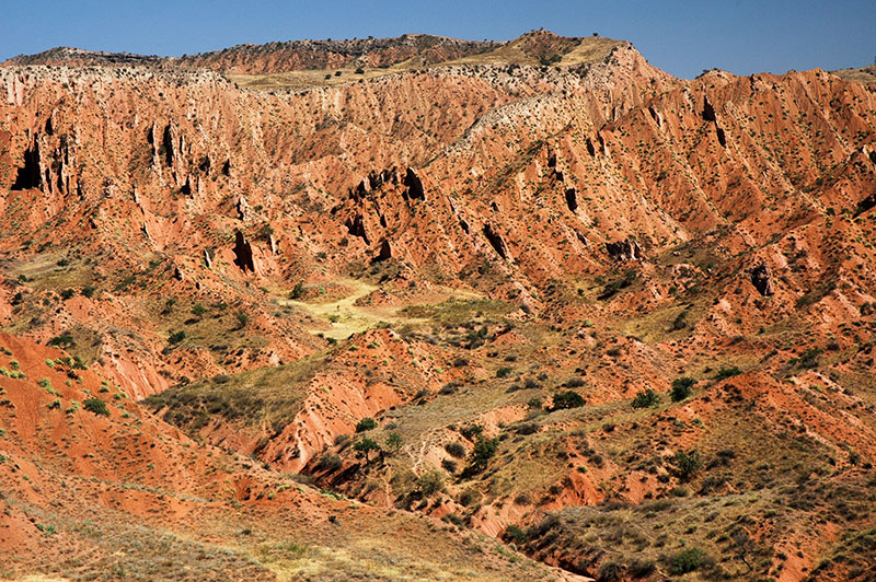 Here the Kyrgyz come up from winter residences in towns at lower elevations to graze animals during the short summer, in a way which remains largely unchanged since the time of Chinggis Khan, and which has survived the horror of collectivisation which has all but wiped it out in neighbouring Kazakhstan. For the first time I feel the full measure of independence the cars give us; we circle the lake on rough tracks at our own pace, stopping to cook meals and sleep wherever we want in this quintessential Central Asian landscape. After two days, we descend from the southeast side of the lake through territory which seems absolutely uninhabited, through soft, rounded hills whose sparse cover of vegetation give them the appearance of velvet from afar. In the rather rough and grim town of Naryn we split, and I head towards the Chinese border.