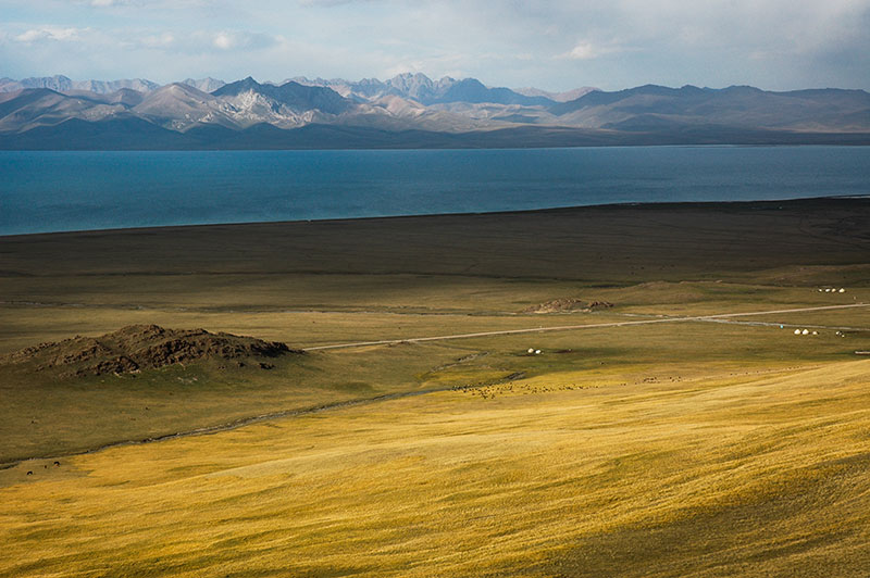 Oliver and I drive east out of Bishkek, in search of the iconic Central Asia of nomads on high grasslands. Just before reaching Issyk Kul Lake, we turn south and then off the road, onto a dirt track which climbs high into the mountains, to one of Kyrgyzstan’s most idyllic spots. Song Kul is a freshwater lake at 3000 metres in a broad bowl of 4000-metre mountains, surrounded on its shores by wonderful green jailoos; lush green grasslands dotted with Kyrgyz yurts and grazed by sheep, cattle and horses. Away from the immediate shore the land starts to rise into grassy ridges which stretch up to a horizon of low, distant mountains. The water is an enticing deep blue, with dappled horses drinking from one of the pebbled beaches; an absolutely magical scene.