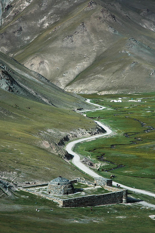 Kyrgyzstan is largely devoid of noteworthy architecture – nomads don’t build temples or palaces – but nestled in the green hills in the southeast of the country, not far from the Chinese border, lies an intriguing relic of the Silk Road. As merchants plodded along these braided trade arteries which passed through vast tracts of desolate and unpopulated terrain, they naturally needed places to rest. These medieval motels, known as caravanserais served that purpose, and can be seen from the Levant all the way to China. Tash Rabat caravanserai is a neat, stone-walled structure built into a hillside, with a cavernous interior chamber topped by a simple stone dome. While the building doesn’t have the architectural merit of those in Samarkand, or Bukhara, its location at 3100 metres in a remote valley surrounded by peaks is what impresses. How harsh conditions must have been in those days, the days when Marco Polo made his voyage along this route, to Cathay (China).