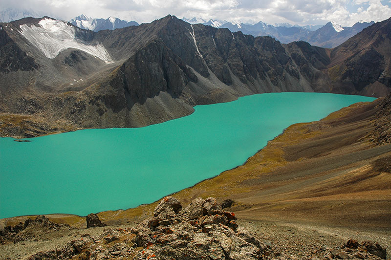 I leave town one afternoon, heading south on a track which climbs up into the mountains to an area of hot springs set in a gorgeous alpine valley known as Altyn Arashan. The low evening sun casts a soft, golden glow along the pine-clad flanks of the valley, illuminating the brilliant white triangle of Mt. Palatka, a 4500-metre peak which presides over the end of the valley. It’s a fairytale scene without so much as a telephone line or a car horn to spoil the views and therapeutic tranquillity. In the morning I set out with seven others for a short day-trek. We head up the Arashan valley and separate as we find our own pace to walk at. The forest makes a wonderful change from the endless plains, deserts and barren mountains of Central Asia, with its wonderful fragrant pines and damp spongy, moss-covered ground, tranquil but for the burbling of mountain streams. I start to climb too early however, and end up having to wade through two leg-numbing roaring mountain streams before finding the right track which leads above the treeline to a large, barren amphitheatre. I move past the others in the group who are uncertain of how to proceed, as we are at the foot of near-vertical 200-metre high scree-slope. The ascent is arduous, treading gravel for an eternity, at times on all-fours, but at the summit of the 3900-metre ridge I am rewarded with a mind-bending view of Ala Kul, a milky, turquoise lake which sits in a rent in the Earth almost 400 metres below me, fed by deeply incised glacial streams. To the south is a 180º panorama of twisting, interlocking peaks of the Tien Shan, the western edge of a great range of mountains which run far into China.
