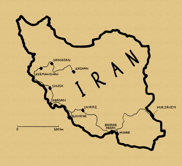 The time comes to leave Mehdi and his welcoming family, and the warmth of the coast, and head inland to make the journey of just over eight hundred kilometres to the Pakistani frontier. The road climbs through cold, purple-tinged mountains, crossing a high pass back onto the Iranian Plateau, now lashed by damp, freezing winds. It’s a scene of marvellous desolation where dark, barren mountains float on the endless gravelly plain as I head north on Highway 91, then east onto Highway 84. Shortly beyond Bam I slip through a security checkpoint unnoticed and enter wild Sistan and Baluchistan Province, which every Iranian has warned me is unsafe. While I know this is rather over-hyped, I am nevertheless glad to reach the capital Zahedan without incident, well after dark. I remember Zahedan as a wild, swelteringly hot frontier town where I was struck down with heat exhaustion and dysentery in July 2003, but tonight I stop only long enough to have dinner. I continue alone towards the border but am finally stopped at a police checkpost around fifty kilometres short of the border crossing at Mirjaveh. In the morning I am given a gormless, unarmed teenage conscript as a ‘guard’ and before long am processed at the customs hall and ready to leave the Islamic Republic of Iran.