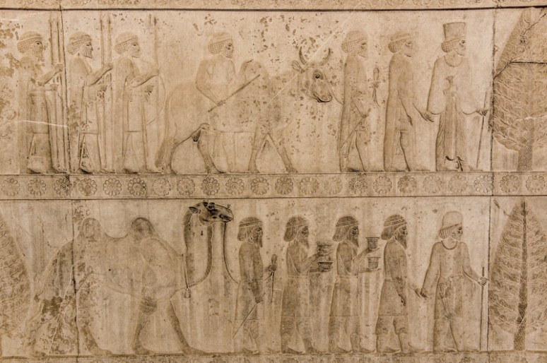 Darius oversaw the expansion of the Achaemenid Empire to its greatest extent; connecting the ancient civilisations of Mesopotamia and Egypt to the Mediterranean in the west and the Indus Valley in the east, by far the largest empire the world had ever seen at the time. Persepolis was the cultural centre of this and it is thought that on the Iranian New Year Nowruz, still widely celebrated today in Iran and many surrounding countries, delegates would come from across the vast land empire to pay tribute to the great Shahanshah, the king of kings, and be thoroughly awed and humbled by the grandeur of the palaces of the imperial capital. It is the surviving bas-reliefs depicting such scenes which make Persepolis so much more compelling than other ancient ruins in the region, for their crisp depiction and detail, thankfully still on show in the open rather than being museum pieces. One experiences these scenes when passing through the tall doorways of the palaces and, most spectacularly, on the Apadana Staircase, a long walkway leading to the royal audience hall. The sides of the Apadana show supplicants in brilliant detail of their distinctive dress, bearing gifts, having made journeys from across the empire; from what is now Iran, Afghanistan, Armenia, Tajikistan, Uzbekistan, Iraq, Syria, Pakistan, Turkey, Egypt, plus parts of Greece, the Black Sea Region, Arabia and Ethiopia.