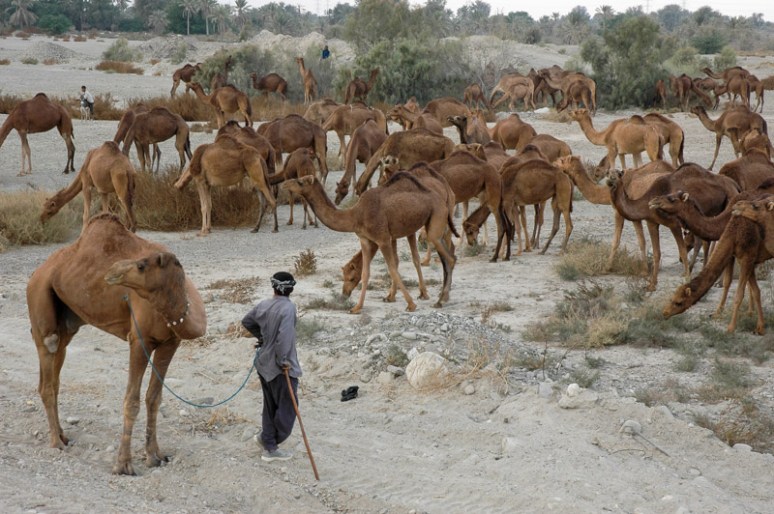 The next day is New Year’s Day in the Western calendar, but I’m barely aware of the fact. I leave my base in the town of Zarghan and begin a circuitous route southwards towards the southern edge of the Zagros and the Persian Gulf. I pass the huge salt pan of Lake Bakhtegan, driving on small county roads until, well after dark, I get lost and end up on a dead-end road in a dusty village in the middle of the desert. Retracing my steps I find the correct road but am almost out of fuel when I’m stopped and detained by the police in the small town of Lar, where I sleep in the police station’s mosque. The next day everything is better; the matter with the police is sorted and I find that a curious noise from one of the rear wheels is just loose wheel nuts from a tyre changer in Shush who failed to re-tighten them. Leaving Lar, the scenery is striking as I enter the folded ridges of the southern Zagros, where the high plains turn into waterless desert; a huge arid region which extends all the way east from here to the Indus River in Pakistan. The road passes through sweeping, dry valleys punctuated with domed water cisterns and sparse acacias, then crosses a low pass to the south in order to enter the next valley on its the way down to the sea. People here look different; darker skinned and poorer as I wind down through villages of shabby hovels, goats and camels, onto the barren coastal plains of Hormozgan Province.