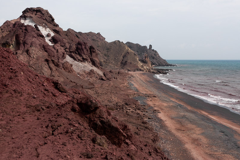 On another day, Mehdi and I make the short journey from Bandar by motor launch to the island of Hormuz, at the northern edge of the politically sensitive Straits of Hormuz. All across southern Iran, salt domes appear amongst the folds of the Zagros, pushed to the surface by their own buoyancy compared to surrounding rock. Hormuz Island has formed by the actions of one such salt dome, and parts of the island’s surface are pure salt. Despite being tiny and waterless, the island has a long history owing to its strategic position on maritime trade routes, though it was the Portuguese who left the most enduring mark, in the form of a fortress with an underground church and water cistern hewn out of the native red rock. Whilst enjoying the warm sea breeze we meet an Iranian woman with her daughter and friend, and the five of us hire a taxi to drive us around the island. On a beautiful beach on the south coast, where soft, salty red rocks dissolve into the lapping seawater causing it to take on a blood-like colour, we paddle with the girls, who even go so far as to remove their headscarves. In a country where it is technically illegal for unmarried or unrelated men and women have any kind of social interaction, this feels like a rare treat indeed. In more than two months in Iran, it is the first time I have seen a women’s hair in public and the only time where a young woman has felt comfortable enough to open up to any degree in public without continually looking over her shoulder.