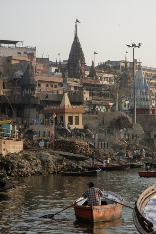 At Manikarnika Ghat (a concourse of steps leading down to the banks of a river), one sees laid-bare one important aspect of Hinduism, in fact of life itself: Death, in the funeral ritual of Antyesti. Varanasi is a holy place to die; it is said that anything which dies here will break free from the cycle of endless rebirths, and the soul will be transported to heaven. People come to Varanasi to die, and along the river there are buildings full of old people waiting to do just that. These ghats on the Ganga are the municipal funerary grounds, and the air is thick with the smoke of numerous funerary pyres. The body of the deceased, wrapped in new clothes, is brought down to the riverside by members of a caste of untouchable undertakers, who ritually cleanse the body in the murky green waters of the Ganga. The chief mourner, generally the eldest son of the deceased (women are not permitted at the funeral, lest their displays of emotion prevents the gods from accepting the soul into heaven), his head shaved, and dressed in the mourning colour of white, leads the service. The body, rigid, emaciated and cocooned, is placed upon the pyre, feet facing south, and an untouchable carrying a flaming handful of straw from a nearby temple sets it ablaze. The fire soon consumes the body, giving off a subtle but nauseating odour. The critical point is the breaking of the skull, which releases the soul of the deceased into the hereafter. The bereaved men look on, showing no emotion aside perhaps from a hint of celebration as their loved one’s soul departs, unmoved by the destruction of the soul’s Earthly vehicle. It’s a deeply telling scene of Hinduism.