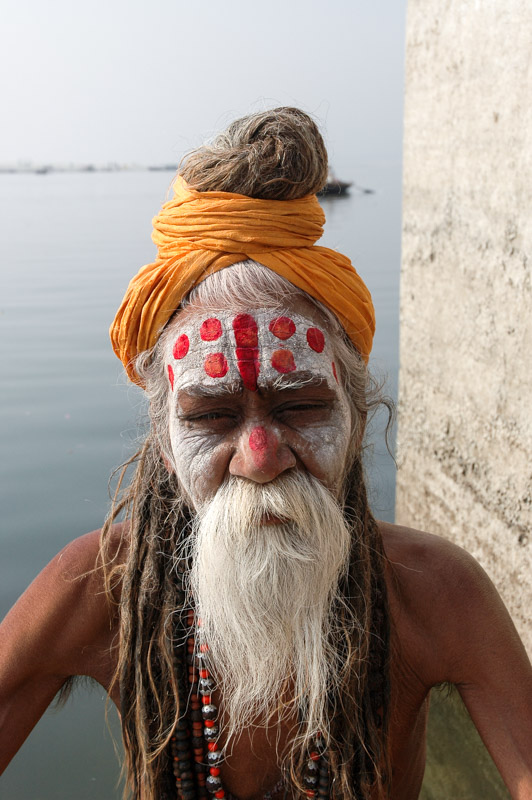 This amazing spectacle unfolds openly, hundreds of times each day along the short stretch of ghats here in the city’s old centre, whilst in a street not twenty metres away motorcycles wind through crowds of busy pilgrims, foreign tourists and itinerant cows. A hundred metres downstream of the funeral ghats, close enough to see the last remains of funeral pyres floating past (plus plenty of sewage outfalls), hundreds of pilgrims gather at dawn each day to bathe in this most holy of Indian rivers; families bring their aged relatives and help them into the soothing murkiness of the Ganga, children are anointed with its waters and people will even take nips of the stuff. The streets throng with visitors, holy men, souvenir peddlers, beggars, con-artists and pickpockets, all jostling through the crowded bazaars and deftly avoiding the numerous piles of cow manure.