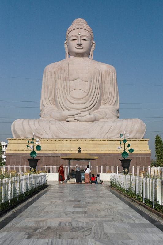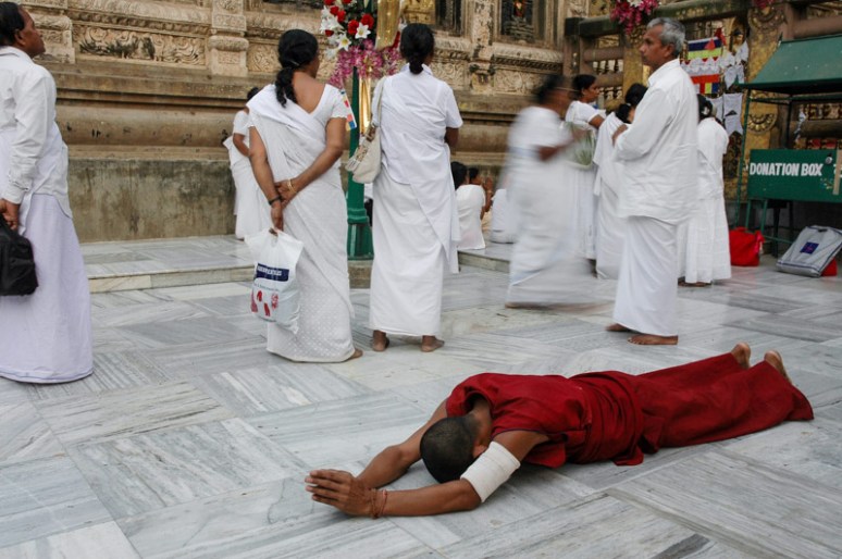 Sometime shortly after 500 BC, at the southern edge of the Gangetic Plain, south of the city of Patna in the sweltering green plains of the state of Bihar, Prince Siddhartha Gautama, one of the region’s many haggard mendicants and renouncers, sat under a pipal tree. He was tempted by a she-demon with all the pleasures of the world, and in denying them attained supreme enlightenment, to become the Buddha. Today, this sacred spot, the most holy site for Buddhists, lies in the village of Bodh Gaya. Though Buddha would have rejected the notion of making a place, or even himself, the object of adoration, such is the human need for some physical object of worship, that the village has grown into what resembles an embassy district of temples constructed by various Buddhist countries. In the desperately poor Bihari rice paddies, amid scenes of un-mechanised agriculture which must have changed little since the time of the Buddha, stand the temples, monasteries and guest houses from Tibet, Nepal, Sikkim, Bhutan, Sri Lanka, China, Myanmar (Burma), Thailand, Vietnam, Japan, Bangladesh and South Korea. Monks flit around town from their respective centres, dressed in crimson, bright orange, mustard brown or sepia robes, amongst pilgrims from all over Asia. At the centre of the entire complex is the 5th to 6th century Mahabodhi Temple, built next to the very point upon which the Prince Siddhartha is said to have sat, where there stands a tree which is said to be a descendent of a tree in Sri Lanka which itself was a descendent of the original. To this revered spot, some come after days, weeks, months, or sometimes even years of painful prostrations; moving two steps before stooping to lie flat on the ground, pressing their forehead against the Earth, their palms pressed together ahead of them in prayer.