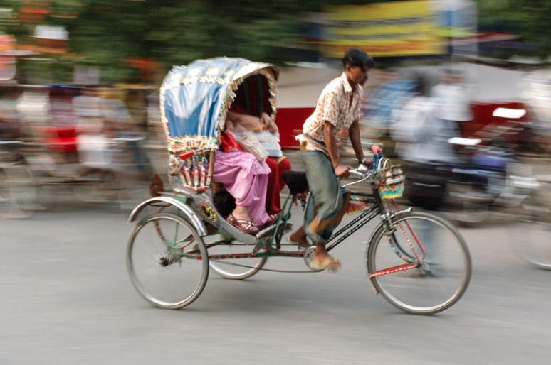 Dhaka’s public transport system is predictably startling. The buses are quite a sight; not for their decoration, as in Pakistan, but for their bodywork, which has the appearance of having been worked-over by an angry, hammer-wielding mob. Not one square centimetre is flat, and the skin of the bus resembles a hand-beaten copper bowl. The reason for this becomes obvious on the cripplingly choked streets of the city, where the buses are all in competition for fares, and race along with reckless abandon up to traffic lights, stopping in such a way as to obstruct other buses from passing. To counter this, shunting is an accepted technique, as is clipping corners. A small shunt will not so much as move the eyebrow of a driver, though the loss of a wing mirror may elicit a tirade of abuse at his driving adversary. All this time, the ticket boy, who manages to keep his balance inside the careening and crashing bus, and remember exactly who has, and who hasn’t paid, is busy shouting out destinations (important in a country where many are illiterate), and physically cramming more and more passengers on the already far-overloaded bus. The opportunities for death and serious injury are rife, and constant.