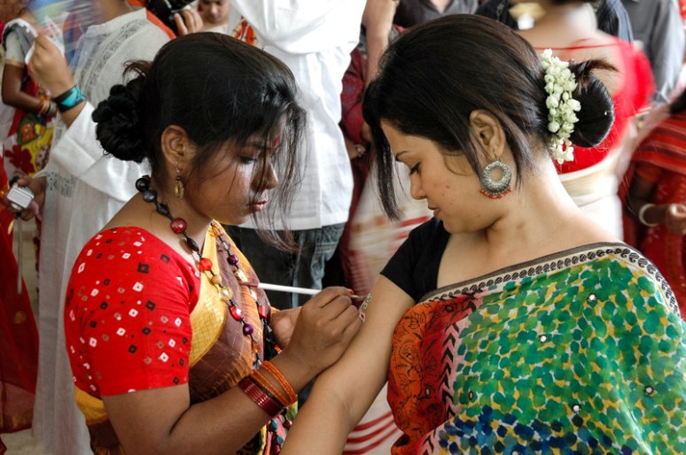 Before leaving the city, Joyanta tells me of an upcoming festival; Bengali New Year. It’s a tradition which has been revived by the city’s strong alternative student movement, to become a notable middle-class festival, though the attractions are as much the artistic output of the central university as of clear folk beliefs. Like Pakistan, the middle class here are not too numerous, but being Dhaka there are throngs of brightly clad, well-fed and beautiful people. The women here are striking, with beautiful smooth, fair skin, and large, dark, slightly elongated eyes. For the first time in the Indian subcontinent I see a concentration of genuinely attractive women. They remind me of the girls on the temples in Khajuraho.