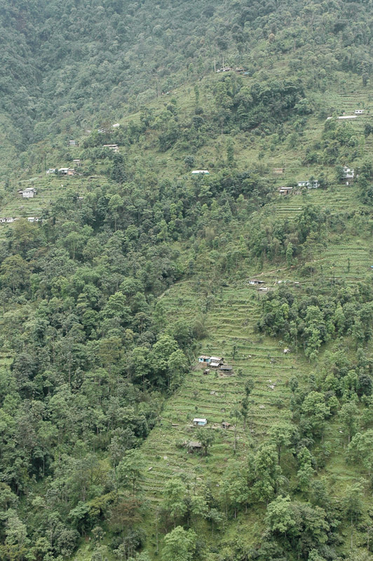 Next day Duncan and I drive across the centre of Sikkim on narrow, winding roads which cross valley after valley of steep, lush, green terraced hillsides, dotted with simple whitewashed homesteads which exist in stark isolation on the roadless slopes. We make a stop at the 18th century monastery in Pemayangtse, one of the most important monasteries in Sikkim. Despite being relatively close to the Bihari plains where the religion was born, the monks of this monastery, like virtually all monks of the Himalaya, practice the Mahayana school of Buddhism. In contrast to the earlier Theravada school, this later and now more popular school of Buddhism made the journey west out of India, through the Khyber Pass into Afghanistan, up across Central Asia and back east into Tibet, where it crossed the Himalaya into Sikkim before spreading further east to China and Japan.