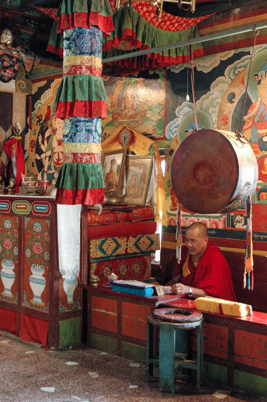 The monastery is a striking building, typical of Himalayan architecture; of square plan, whitewashed with a two-tiered yellow pagoda roof. Around the perimeter fly tall prayer flags of red, green, yellow, blue and white cotton, printed with prayers which the faithful believe will be taken around the world by the action of the wind. The interior of the building, which has the unmistakable smell of butter lamps and burning juniper branches, is decorated with rich frescoes of fantastic Himalayan deities, a beautiful artistic rendition of the great powers which local communities believe inhabit the mountains.