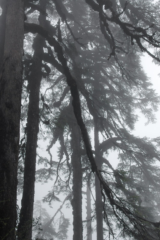 The trek starts at a leisurely hour the following morning, under steady rain. Duncan and I have our Gurkha guide, Bob, as well as three Butiya (Tibetan) ‘yak boys’ who are leading two huge yaks which carry our kit. The first two days are a steady climb in the patchy rain; occasionally the clouds will part just sufficiently to reveal the far side of the valley; a verdant, untouched jungle of dark, damp cloud forest. We pass tiny, isolated settlements of simple, subsistence farms which lie in small clearings in the tall-tree forest. The blocky whitewashed stupas which mark high-points of the trail, surrounded with damp prayer pennants seem almost organic in this Himalayan landscape. On the second day, as we climb to four thousand metres, the trees become shorter and the forest thins and blends into rolling dark green hillsides of wild rhododendron as we approach the mountain hut at Dzongri.