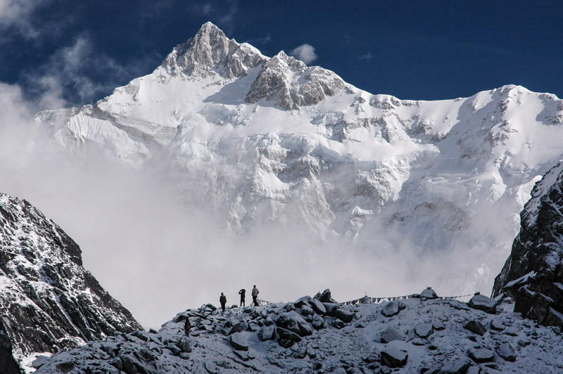 The third day is an acclimitisation day, trekking in thick, low cloud to a murky grey lake and back in order to give our bodies an extra day at this slightly rarefied altitude of four thousand metres. Our destination on the fourth day is Thangsing, a wide meadow upon which the yaks are let loose to graze. It is from here that we will make our attempt at 01:00 the following morning on the Goeche La. Bob complains unconvincingly of being ill – unless laziness is an illness – and tells us he’s sitting out the final leg. Nevertheless, as we stumble out of our four-thousand metre hut into the freezing night, our spirits soar when we see a clear night full of stars, and we make good progress up the valley and onto a moraine. The sky is illuminated in vivid pinks at dawn, and we soon see that we are surrounded by a vast amphitheatre of sublime mountain scenery. But the pink clouds are a warning of impending cloud cover, and it’s a race against the power of the monsoon to reach the Goeche La before all views are obscured. It’s a tough march in the thin air, but we reach the final pass at around 07:00, just as the first clouds begin to rise. The view is utterly magnificent; despite standing at very nearly five thousand metres above sea level, Kanchenjunga soars more than three-and-a-half kilometres above us, a solid wall of snow-covered glaciers and rock, occasionally showing its real light grey colour where the face is too steep for snow to settle upon.
