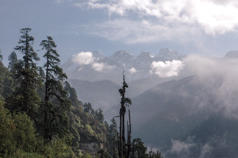 I am not a fan of needless physical exertion. My motivation for trekking lies purely in the prospect of seeing scenery which is not accessible by other means. The actual exertion, the physical challenge of walking up mountains, in itself holds no appeal for me. The first two days therefore, are rather dull and unrewarding. Bob, our guide, at times looks rather worried at our progress, and expresses doubts that we will make it to the ultimate destination of the trek, the Goecha La, a 4,920 metre pass at the foot of mighty Kanchenjunga. Whilst I am in no doubt as to my physical ability to reach the mountain, I have nagging worries that on the entire nine-day trek we will be walking through this endless, miserable cloud, and not catch a single glimpse of the world’s third-highest mountain which lurks just beyond. My morale is therefore boosted somewhat when, at sunset on the second day, from a low peak just next to Dzongri, the clouds finally part to reveal distant, snow-flecked mountains. Not the big one, but inspiring nonetheless.
