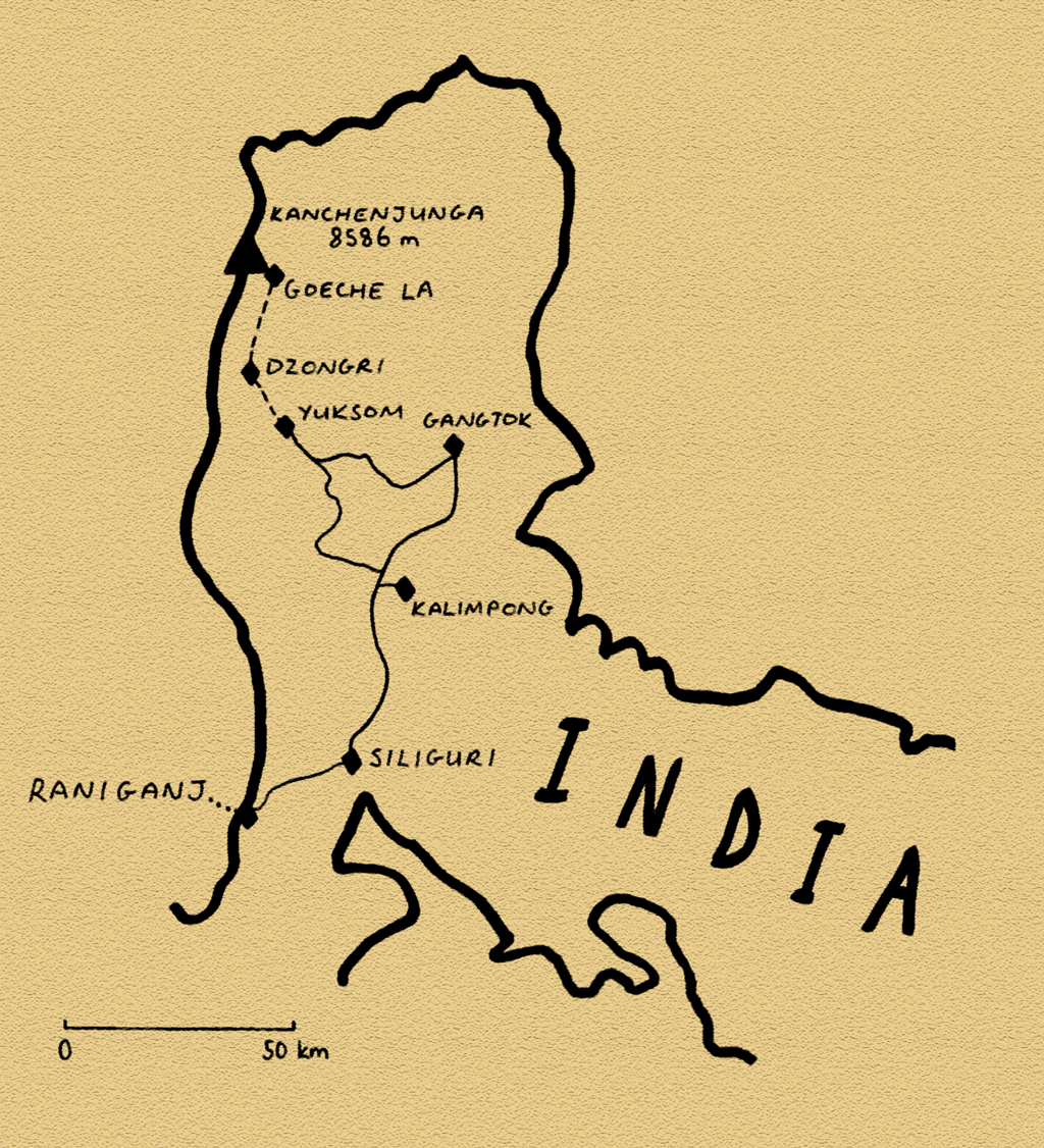 My reason for visiting Gangtok is to organise a trek high into the restricted mountains of Sikkim, in order to get close the holy mountain Kanchenjunga which at a height of 8,586 metres is the third highest in the world, the easternmost of the fourteen ‘eight thousanders’, and the highest in India. As the area is a restricted border zone, it’s necessary to take a licensed guide, so I approach a few trekking agents in the hope of joining a group which will depart soon. Due to the arrival of the monsoon season, which blocks mountain views with vast daily barrages of cloud and rain, I’m unable to find a group to join, and must contemplate the expense of taking a personal guide and porter. I wander the streets for a short time, until I spot another foreigner and ask straight out if he’d like to join me. His name is Duncan, British, twenty-nine, and we soon agree to leave on a trek as soon as possible. And thus began a deep and lasting friendship.