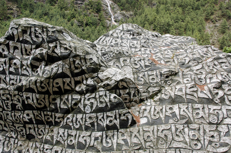 My reason for coming to Nepal however is to see more of the world’s tallest mountains, far to the north in the district of Solu Khumbu, or simply the ‘Everest Region’. One very noticeable aspect of Nepal having not been part of colonial British India is a glaring lack of infrastructure. Everest is almost two weeks’ walk from the very last town accessible by road, and so I decide to save around ten days of walking by flying from Kathmandu to the airstrip in the Sherpa village of Lukla. Kathmandu’s domestic airport has the air of a bus station, with frequent arrivals and departures of small propeller aircraft, which are the only means other than walking, of reaching many parts of the country. After an interminable wait, and thirty minutes after what was meant to be the cut-off time, my flight is called and I board the small Dornier turboprop aircraft. There are fifteen passengers aboard, of whom three are foreigners, and one very attractive stewardess who hands out small wads of cotton wool for the purpose of plugging ones ears against the drone of the propellers, and small toffees. She takes the pilot a Snickers bar and something wrapped in an air-sickness bag, presumably not vomit. We fly just above the boiling froth of monsoon clouds, only once glimpsing a distant peak to the north very briefly. Once again I hope that the clouds won’t prevent me from seeing the mountains throughout the trip. The landing at Lukla is memorable; the aircraft lands heavily at the bottom of a steeply inclined asphalt airstrip (one wonders how the asphalt was brought here), which hovers above an abyssal valley. At the top of the airstrip, it seems the aircraft will crash straight into the mountainside, but swerves at the last moment sharply to the right and comes to a stop neatly outside the stone-walled terminal building.