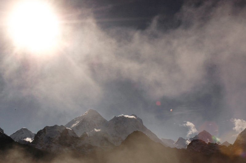 The last, steep stage to Gokyo passes the terminal moraine of the Ngozumpa Glacier, the largest in the Himalaya, where a violent tongue of milky brown water cascades from the tongue of dirty-brown rock-strewn ice which creeps incessantly down from the bases of the world’s largest mountains. Gokyo, which lies at 4,770 metres, is one of the very highest settlements in the world and is sustained by the trekking industry. To my relief, I find an operating guesthouse, and check in. The village lies squeezed between the turquoise waters of a glacial lake, and the right-lateral moraine of the Ngozumpa Glacier. Scaling this tongue of glacial rubble on a clear morning, one can look all the way up the grey conveyor-belt of ice and rock to view a wall of glaciated rock which marks the Tibetan border and is crowned by the 8,201-metre peak of Cho Oyu, the world’s sixth highest mountain. The real aim of being in Gokyo however, is to ascend a ridge just beyond the village to a small peak known as Gokyo Ri, which at 5,383 metres provides a spectacular viewing platform towards Everest. One must start the ascent at around 02:00 in order to catch dawn from the summit, and on my first morning, I am just beaten by the clouds which swirl in front of the highest peaks, largely obscuring them. On the second morning, the sky is wrapped in cloud, and I stay in bed. The third morning, initially obscured, clears just before dawn, and I make a belated half-ascent, only to be beaten by the clouds halfway up (and meet a smarmy Frenchman who had perfect views from the summit). It is not until the fourth morning of staying in this rarefied village which lies at an altitude very close to that of the summit of Mont Blanc, that I manage to reach the summit of Gokyo Ri and observe the day begin behind three of the five highest mountains on the planet.