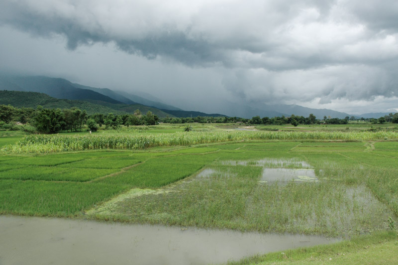 I stay for a while in Kathmandu, doing some car maintenance, spending evenings with Liam in a local café, then make my move back out of the mountains, down through the green Himalayan foothills and back to the country’s east-west artery, the Mahendra Highway. In this verdant southerly strip of lowland Nepal, known as the Terai, the monsoon is in full swing, bringing the temperatures down to more bearable levels with torrential deluges of monsoon rain. I stop on the first night in a hotel in the town of Kohalpur, and continue my westward journey the next day. Large, black clouds collide with the foothills, and in one place, where the road is being washed away by a flash-flood, I get chatting to a Nepali motorist who is also waiting for the floodwaters to recede. Deepak, a Hindu poultry farmer who is driving a pick-up full of eggs to Mahendranagar, the last town on the Mahendra Highway, tells me there are more than just natural problems ahead.