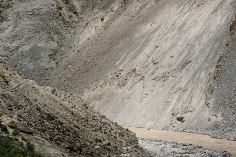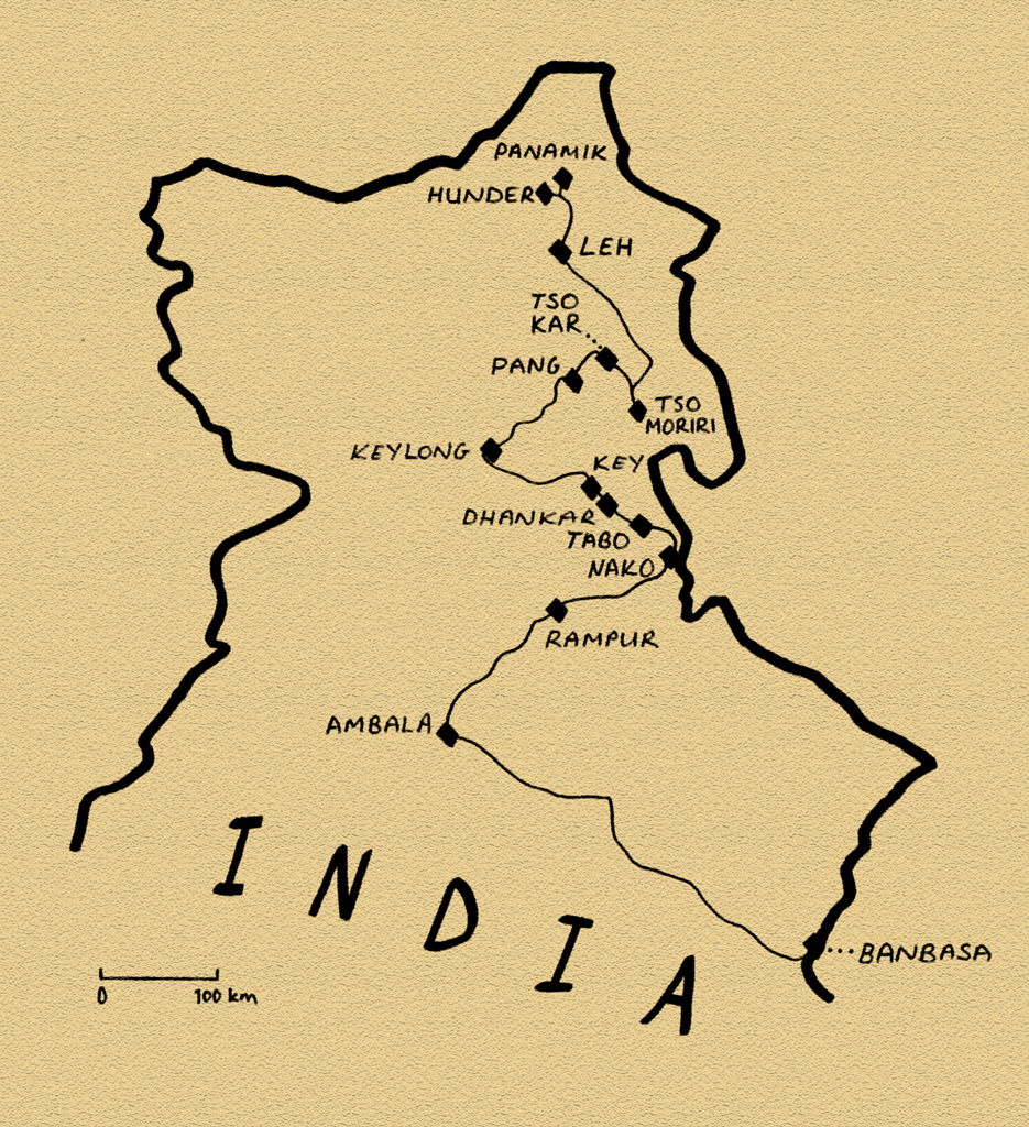The road up the valley of the Sutlej, one of the five rivers of the Punjab, is quite a feat of engineering. In many places it has been blasted from a sheer rock face, and winds along the near-vertical valley walls, hundreds of metres above the raging white-water of the river. The road follows the river upstream almost all the way to the Tibetan border, with the valley becoming ever drier and more spectacular as it climbs further from the monsoon-swept plains of lowland India. A few kilometres from the frontier, in a huge brown-grey valley of yawning alluvial hills utterly devoid of vegetation, vastly complex, twisted, tortutred geological strata in the rock exposures attest to a violent recent history. This is the Himalayan suture zone where the Indian Subcontinent met Eurasia roughly fifty million years ago, and continues to do so today. At this point the road turns due north into the Trans-Himalaya, entering the Spiti Valley, through which it will climb to the edge of the Tibetan Plateau.