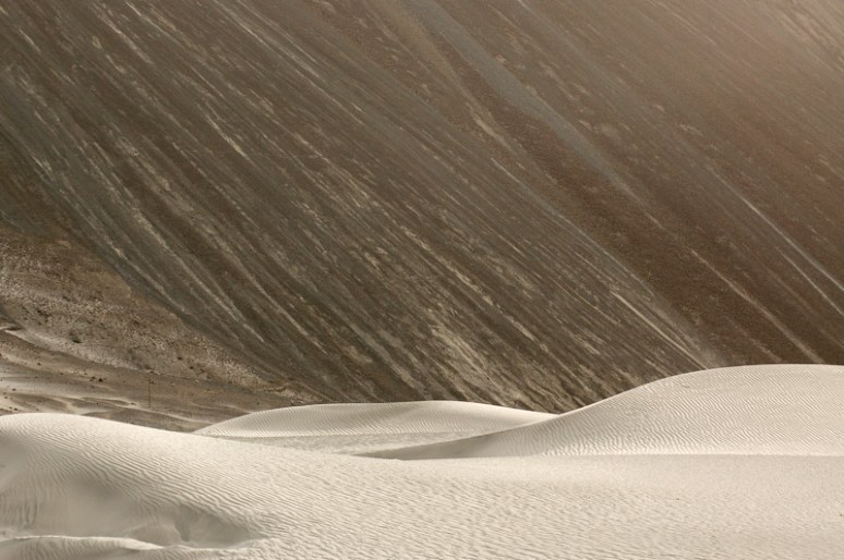 Having passed the blithering Indian Army, we descend to an environment quite different from the Chagtang of Ladakh. We camp overnight in an apricot orchard in the village of Diskit, before moving as far east as is possible for foreigners, the village of Hunder. Hunder is a sprawling village of apricot orchards, clear river-water running in irrigation channels, and dry stone walls topped by thorny bushes which grow in the gravely alluvial deposits, all of which make it far more reminiscent of the Wakhan Valley in Tajikistan or Pakistan’s Hunza Valley than the sere landscapes of Ladakh. Beyond the village, the broad river valley where the Nubra River joins the Shyok is filled with fluvial sand, which has been whipped into smooth, sensual dunes by strong winds which come from Tibet in the east. We camp in amongst these dunes, a strange mini-desert within the stark mountains, near a group of Czech tourists, whom we befriend. In the company of my Slovenian travel-partners, and the group of four Czechs who sit around a campfire playing music and singing, I’m reminded up here in the austerity of the high Himalaya of the great warmth of the Slavic soul, and I appreciate more than ever the sense of absolute freedom in this fantastic landscape.
