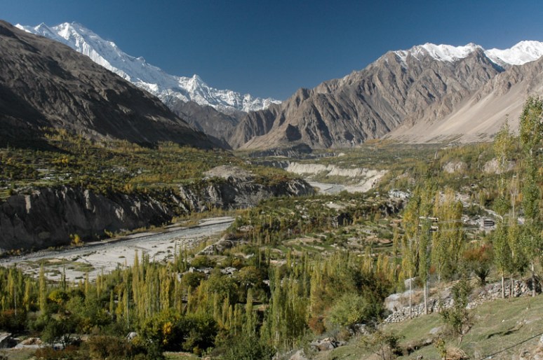 Fifty kilometres down the KKH on the south side of the massif in Hunza proper, lies the charming hillside town of Karimabad. Not quite as spectacular as Passu, Karimabad has a eagle’s eye view of the stupendous Hunza Valley, and is arguably even more picturesque, with its swathes of greenery either side of the Hunza River. To the north, a huge cleft in the massif reveals a glimpse of the Ultar icefall; a tumbling glacier which looks like a colossal frozen waterfall. Sitting at the base of this defile is the impressive Baltit Fort, where the Mirs of Hunza lived until 1945, and whose architecture has elements of the Moghuls and Tibet. Rakaposhi, at 7788 m sits to the south-east and completes the magnificent surroundings of the town. As in Passu the autumn light is magnificent; the world seems to be caught in freeze-frame between the frenzy of summer and the bleakness of winter, a sea of riotous colour etched in gorgeous cool light.