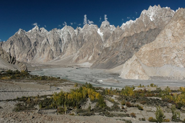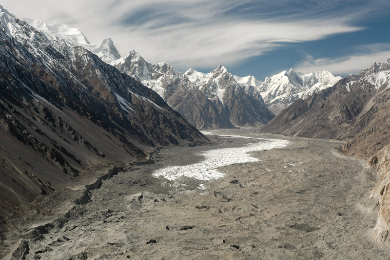 The day is warm and pleasant, and sharp, delicate cirrus clouds spin an ethereal blanket in the turbulent air currents above the massif, mirroring the glacial forms below. The Hunza River flows alongside the KKH far below me, where occasional vehicles pass silently, unknowingly along the terminal moraine of the glacier. Not a soul moves in the valley at my feet, and there is silence but for the occasional groaning of calving ice. On the opposite bank of the Hunza river from the village are barley fields punctuated with yellowing polars, reached by precarious-looking wire bridges which sag just above the frothing glacial water. Beyond this thin strip of agriculture lies an impressive wall of rock; the Cathederal Peaks, a jagged, sharp wall of five to six thousand metres which looks not unlike whipped peaks of meringue. It’s hard to imagine anywhere more beautiful.