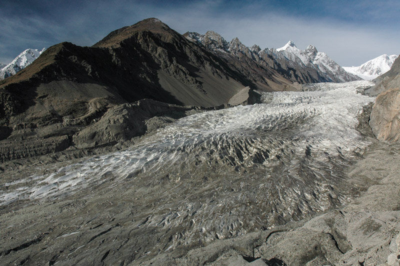 My next stop is the roadside village of Passu, consisting of just a few shops and hotels, located on the east side of a vast 7500 m Karakoram massif, the most impressive stop on my 2003 trans-Asia journey, and possibly my favourite spot on Earth. Walking a little way south of Passu village, one climbs the terminal moraine of the Passu Glacier, walks up its left-lateral moraine, then further up a treacherous scree-slope into the Yunz Valley, which is inhabited seasonally by shepherds who live in rudimentary stone huts with their flocks. From the edge of the Yunz Valley one has an unobstructed vista of the calving white seracs of the cascading Passu Glacier, which winds down in an impressive swathe from the huge, glaciated massif. Climbing still further from the Yunz Valley to a ridge named Golden Top, which sits at 3400 m, one thousand metres almost directly above the village and the KKH, one gets a 360º panorama of some of the world’s most impressive mountain scenery. At one’s feet unfolds over 20 km of the 57 km long Batura Glacier, a vast tongue of ice which is one of the world’s longest non-polar glaciers, and in its lower reaches is a carpet of grey ice and moraine, only revealing a core of clean white ice further up in the centre of the glacier.