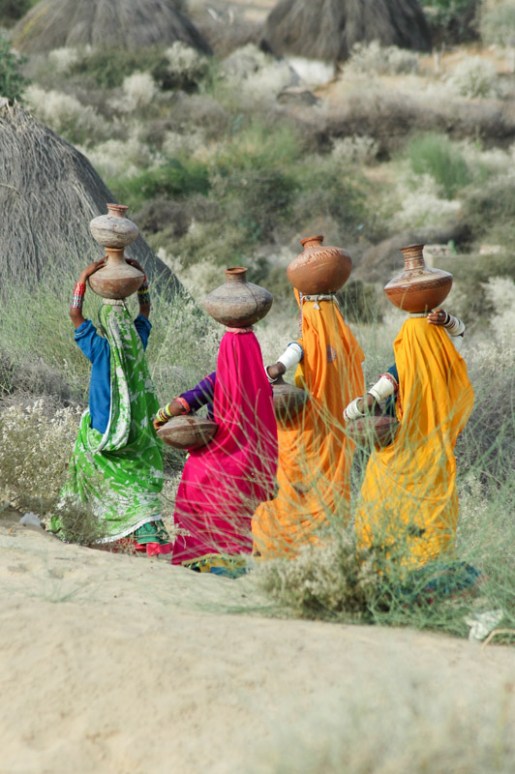Beyond Islamkot the road continues eastwards, deeper into the desert. Out among the sandy hills, in the shade of spiny acacias are tiny villages of simple thatch-roofed rondavels, unlike anything I’ve yet encountered in South Asia. These villages are home to Hindu tribes whose women, arms wrapped in white bangles, wear vividly coloured saris. We spot a group tribal women carrying decorated jugs of water on their heads, their elegant, coloured forms a striking sight against the greys and browns of the desert.