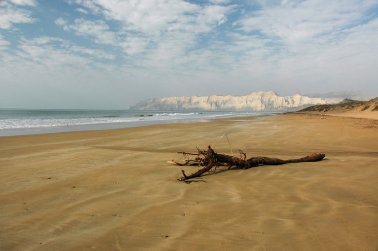 I spend the night in the tent on the back of the truck at a small roadside restaurant in the town of Aghor, pushing on early the next morning. The road soon starts to climb through a knot of dry mountains, truly other-worldly in their sharp, tortured forms. At one point the road draws level to the beach, and I stop to take a look. The beach is probably the best I’ve ever seen; kilometre after kilometre of perfect, clean golden sand dotted with the occasional piece of driftwood, and not a soul in sight. It’s mid December but the temperature is balmy and the water warm. It’s hard to believe one can find such perfection and have it all to one’s self. The road then enters more spectacularly eroded valleys, crossing the lunar landscape of the Buzi Pass then dropping down onto barren plains once more. I stop for lunch in the small coastal town of Ormara, a hideaway for the Pakistani Navy, and a number of Zikris; a maligned Baloch Islamic sect who have adapted their Islam to encompass and additional – Baloch – holy site of pilgrimage, and in doing so encounter the ire of some Sunnis. Ormara is a delightfully slow-paced place, but there’s little aside from the glorious beaches to detain a traveller, and I continue east towards Iran.