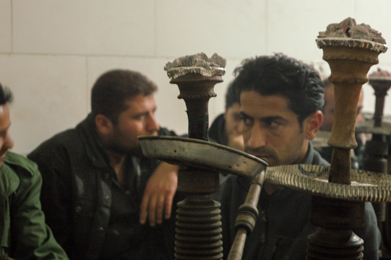 After dark we reach the freezing mountain town of Marivan. The Slovenians head to bed in a comfortable hotel, but Maciej and I, after finding cheaper digs in a rather seedy establishment, go out into town in search of some entertainment, soon finding a warm chaikhana (teahouse) packed with Kurdish men. The atmosphere inside is dark and thick with tobacco smoke, and warm thanks to a brazier burning wood and walnut shells. Rough-hewn Kurdish figures, whilst thumbing strings of rosary beads are engaging in heated conversations over endless cups of fragrant black tea and games of nard (backgammon). Despite being very obviously foreign, Maciej and I are not pounced upon with the usual string of questions, and spend a relaxing time with a huge, ornately turned wooden ghelyun (waterpipe) smoking wonderfully soft and fragrant unflavoured tobacco – far nicer than the rather artificial-tasting apple or mint tobaccos one usually finds in the region.