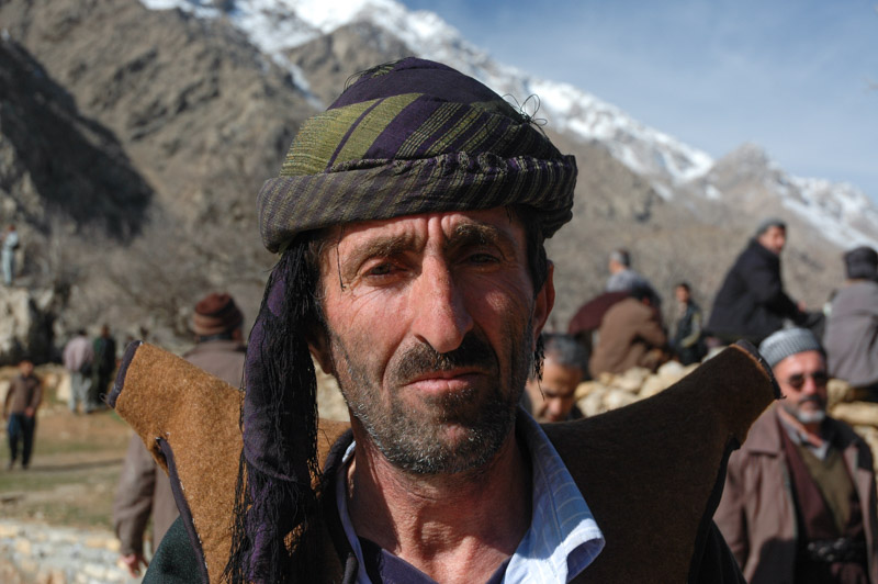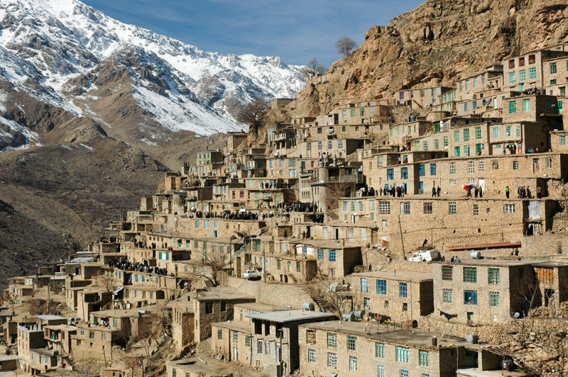In the morning we head out to our intended destination in Kordestan, the small, isolated Howraman Valley which lies right on the Iraqi border, and hosts the uniquely Kurdish mid-winter Pir Shalyar festival. Pir Shalyar was a (perhaps mythical) Zoroastrian magi (saint) whose marriage to a princess nine hundred years ago is celebrated annually by Kurds of the Hawrami clan, who speak an unusual dialect of Kurdish. The valley’s main town, Howraman-e Takht is a picturebook image of medieval-looking stone houses with large latticework windows of green or blue-painted wooden frames, which spill down the steep wall of the valley. It is also the site of Pir Shalyar’s shrine, and the centre of today’s festivities which see the town packed with Kurdish men from the surrounding villages. The older men can be seen wearing a very distinctive felt waistcoat with protruding shoulders, looking almost like the neck of a goatskin. Others wear the more traditional low-crotched Kurdish pantol trousers and kava, which is often rather unflatteringly translated as a boiler suit, held around the waist with a sash known as a peshtend, and almost all wear tasselled black head-scarves.