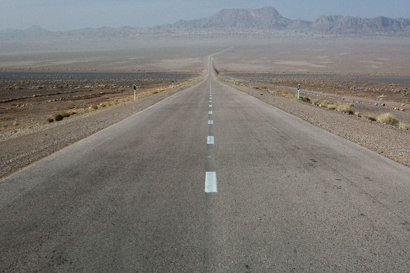 Pezhman and I head east out of Tehran late one night, on the road back towards Mashhad. At daybreak we are in the town of Damghan, where we turn south into Iran’s largest desert, the Dasht-e Kavir, a vast, barren salt waste. We drive along an endless desert road, through barren plains, passing banded pink hills and a vast salt pan where a dust storm blasts across the road, reducing visibility to just a few metres. Desert towns such as Reshm and Jandagh seem trapped in glorious, timeless isolation, but nowhere is the desert as attractive as the abiotic void of the Dasht-e Lut. In the late afternoon we begin to see some distant mountains, and when we reach the town of Ardakan we are back on the Great Eurasian Overland route to India.