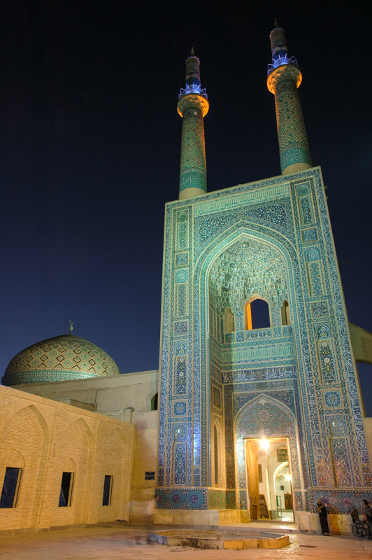 We are heading for what was, on my first visit to Iran in 2003, my favourite city in the country. The desert city of Yazd is a jewel of unique architecture, Zoroastrian culture, and magnificent, winding mud-brick bazaars. Yazd’s fourteenth century Jameh Masjid (Friday Mosque) is an architecturally unique structure; one of the most striking in the Islamic world. Its soaring rectangular iwan (portal), covered in exquisite faïence and lines of Kufic tile-work is supported on one side by what looks to be a flying buttress, and topped directly by two closely set, needle-like minarets, which are said to be the highest in the country. The mosque was an iconic image of my 2003 journey, and may well have inspired my great love of Islamic architecture.