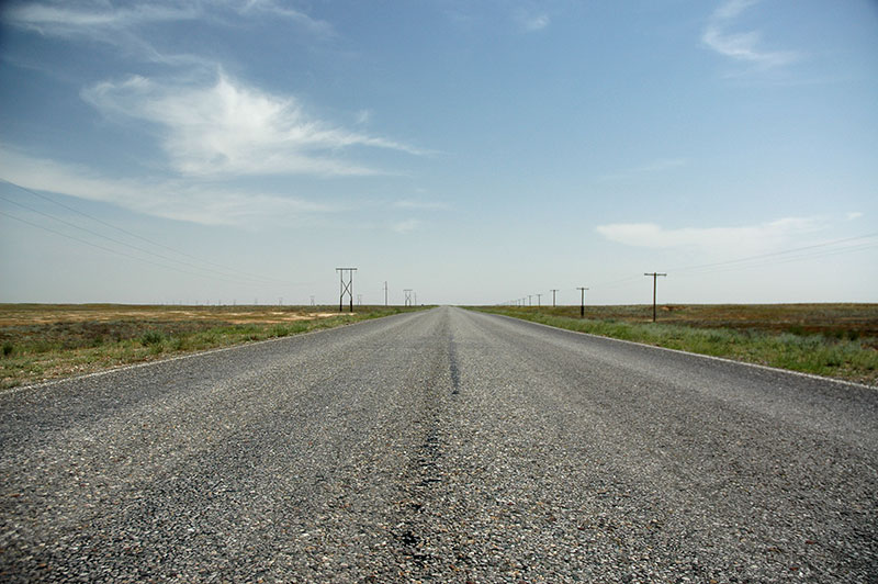 Leaving Aktobe, we are back on the long, featureless highway. The road is in pleasingly excellent condition however, in stark contrast to the appalling broken asphalt I had encountered in the north-east of the country three years earlier. Not far from the city limits, a road sign reminds us of the vast scale of the country: ‘Almaty 2304 km’. We drive through a massive, empty landscape past Khromtau (‘Chrome City’) with its piles of grey-green mine tailings, the only thing to catch the eye for scores of kilometres around. We fill up with fuel in the junction town of Qarabutaq, then turn north towards Kostanai. The land flattens further and we enter an absolute nowhere.