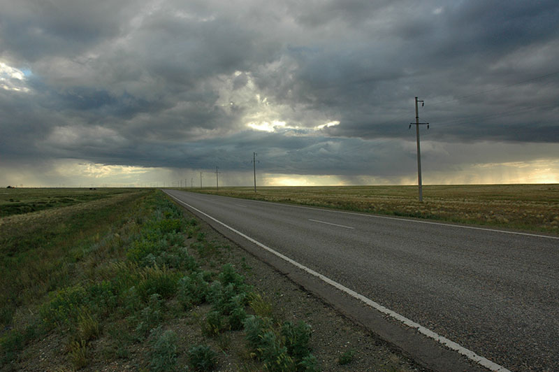 Our onward journey continues past the similar mining town of Rudny and then Kostanai, the provincial capital, from where the road heads south-east across yet more hundreds of kilometres of nothingness. A modest patch of pine forest near Esil provides a few minutes of genuine excitement for us, and then later an impressive storm breaks over the steppe near Atbasar, but otherwise the journey is simply hundreds of kilometres of soothing monotony. The land here in this sub-Siberian belt of northern Kazakhstan is very slightly damper than that to the south, and the area was the focus of Khrushchev’s 1953 ‘Virgin Lands Campaign’, a plan to dramatically increase the wheat harvest of the USSR. Though early years were sporadically successful, the marginal soil was soon depleted of nutrients, yields dwindled and Kazakhstan lost millions of tons of topsoil as a result of wind erosion. Today the area is largely fallow, subtly changed from the wild, virgin steppe to the south.