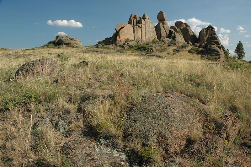 After thousands of kilometres of flat grassland, Bayanaul is a welcome change of scenery with its gently forested hills backing a warm turquoise lake whose sandy beach understandably attracts tourists in this vastly inland environment. After a very Soviet canteen lunch at the lakeside sanatorium, we head off in the truck into the hills to explore the bizarre volcanic formations whose rounded and wrinkled contours lend them a form something like giant sheep droppings. With us are our American host Mary, a Peace Corps Volunteer from New Orleans, and her rather eccentric Kazakh landlord who acts as our guide. Away from the central ridges around the lake, the surrounding prominent, oddly-sculpted hills are dotted with small fir and birch trees, and their obvious attraction in such an otherwise featureless environment is marked by pre-Soviet Kazakh graves, and far more ancient Scythian-type burial complexes consisting of a recessed central crypt surrounded by large, standing megalithic slabs partly submerged in the soil. The like of these may be found across the grasslands of Eurasia, from eastern Siberia to eastern Europe, attesting to very expansive nomadic empires of old.