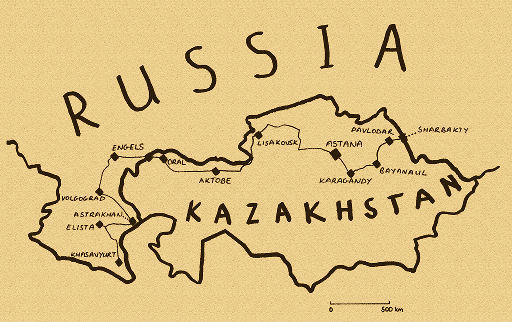 Telegraph lines recede into the distance where the land ends and there is only the glare of the sun through the accumulated kilometres of air. Tracking the Russian border, the road slowly deteriorates and we pass crumbling Slavic villages of once pretty white-washed homes with light blue window frames, now often abandoned and raided for building material. Some have Ukrainian names such as Kievskoye or Don, reminders perhaps of Kazakhstan’s painful Soviet history as a place of exile. There can’t be many countries whose ethnic make-up – with descendant populations of Russian, Ukrainians, Poles, Germans, Koreans, Tatars, Chechens, Ingush, Kalmyks, Turks and many more – has been so influenced by the paranoiac machinations of one man.