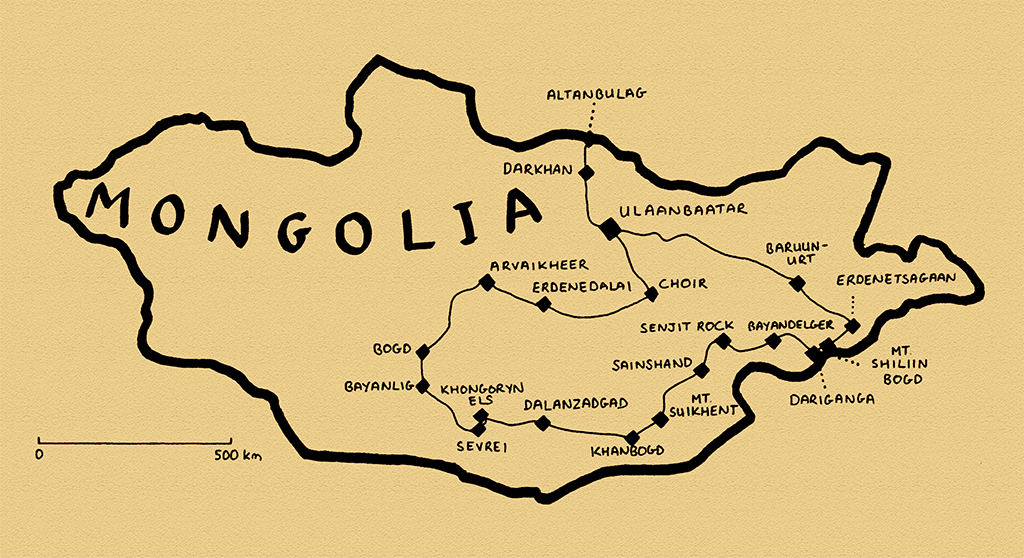 We reach Baruun-Urt after midnight and camp in a patch of open ground in the centre. In the morning Bayarmaa, who is very apologetic for the predicament we have found ourselves in, helps us get our permits to drive to the capital, then even buys us lunch and introduces us to her family. The road out of town starts off as a dirt-track, but after a few hours becomes the asphalted main highway which will one day run right across the country. Jacob and I drive on into the night and have a final dinner together before stopping in the town of Öndörkhaan, capital of the province of Khentii from which Chinggis Khan is said to hail, where we part. Jacob has been a fantastic travel partner and I’m truly glad to have had him along for the seven weeks we’ve spent touring nearly the entire country. It’s a sad parting but my time in Mongolia is up (for now), while Jacob will continue to explore the north of the country before heading on to China and Pakistan.