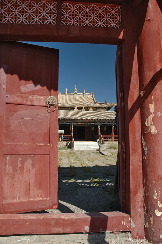 Our destination the next day is Erdenedalai, a small, nondescript sum (district) centre which would be wholly unremarkable were it not for the beautiful late-eighteenth century Gimpil Darjaalan Monastery. The monastery consists of a single, surprisingly large Manchu-style temple which combines an outer perimeter gallery colonnaded with ornately painted wooden beams, with a large central hall, topped by a very elegant two-tier, meticulously tiled pagoda roof. The monastery somehow escaped Stalin’s purge, serving as a storage area until independence in 1990. Its presence is rather baffling on this otherwise totally featureless plain.