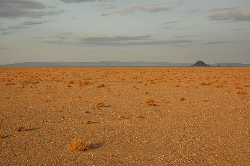 Around one-hundred kilometres from Arvaikheer we leave the Southern Route for good (I break a leaf in the truck’s front-right spring coming down a steep bank too quickly) and proceed south-west, passing Bayanteeg shortly after. Quite quickly the landscape changes again, to the Gobi proper. The Mongolian term gobi literally refers to land which is too poor to support sheep, but on which camels may be grazed. In practice however, the Gobi Desert occupies a vast tract of inner Asia, stretching from here to the Tibetan Plateau and occupying much of northern and western China, encountering a wide range of environments. Beyond Bayanteeg the vistas become huge; we can clearly see Ikh Bogd Mountain on the horizon, despite it being sixty-five kilometres away. Occasional gers can be seen next to dry, ephemeral riverbeds, and we wonder what must draw (or force) people to live in such areas. The land becomes a hard-baked undulating plain, and we course at full speed along a winding gravel track, leaving a huge dust plume in our wake.