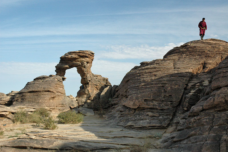 It’s a long drive the next day, passing the huge, eerily ruined complex of Ölgii Monastery, then heading north-east through almost totally unpopulated, largely flat territory as we aim for the tracks of the Trans-Mongolian once again. We camp just short of the town of Sainshand and are met shortly after stopping by a pair of curious Mongols who arrive on an ancient Soviet motorcycle. After making a few gestures to each other, our visitors retreat a few steps and calmly watch us for an hour or so as we cook some pasta and make tea, before slipping away into the night. We reach the railway town of Sainshand in the morning, capital of Dornogovi Province, and by evening we are in a large area of odd volcanic outcrops. Darkness and a howling storm close in on us before we can reach our intended camping spot, and it is not until the following morning that we reach the striking and locally famous natural rock arch known as Senjit Rock.