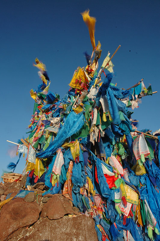 In the night we are rather startled by a lone pair of headlights jolting across the steppe, aiming straight for us; we kill our lights and keep a close eye on the approaching vehicle, worried that it might be the local border patrol coming to apprehend us. The vehicle stops some distance away at the foot of the mountain, and we discover in the morning that a group of Mongolian businessmen from the capital have come to on a pilgrimage to the holy mountain to restore themselves spiritually. We walk up together, the Mongolian men (one of whom speaks good English) wearing expensive traditional deels (coats) and offering us a nip from their snuff bottles. At the summit, the men circumambulate around the huge ovoo which is covered in offerings such as sweets, hard bread and alcohol and tied with long blue prayer pennants which are thrashing in the stiff morning breeze. We drink bowls of vodka together and marvel at the sublime view as the rising sun catches the profiles of the long-dead volcanoes. I’m impressed that these men, like me, seem genuinely enchanted by their surroundings, more so that despite being wealthy and urbane, they have made the long and arduous drive down from the capital just to perform this ritual. Clearly despite money and a modern life, the age-old shamanism of the steppes endures in them.