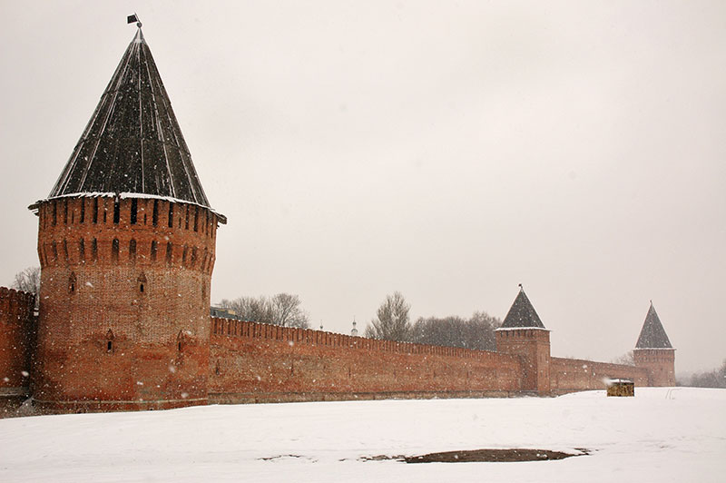 As might be expected of a large and ancient city on the frontiers of a huge empire, Smolensk has a long history of invasion and destruction, having twice slipped beyond the frontiers of the Russian state. Nevertheless, as I walk downhill into one of the city’s small valleys, attractively dotted by dark brown timber houses with colourful wooden-framed windows, I am surprised to find a huge and magnificent sixteenth century kremlin (fortress) looming out of the falling snow on the opposite hill. It’s a beautiful structure with long red-brick walls and defensive towers of alternately square and round in plan, covered by steeply pitched wooden roofs; a real icon of Russian defensive architecture and a symbol of Russia’s western defences. The modern centre of Smolensk somewhat less remarkable, with tall and imposing Stalin-era city blocks, parks celebrating the important role of the ‘Hero City’ during the Second World War, and a grandiose philharmonic hall named after the composer Mikhail Glinka, the father of Russian classical music, who was a born in the city.