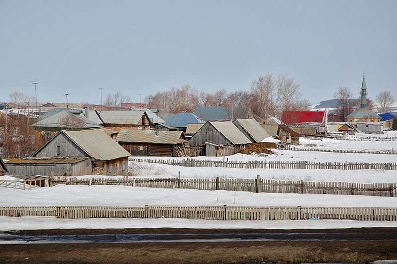 I make a final crossing of the South Urals, heading east from Magnitogorsk through the Bashkir towns of Abzakovo and Beloretsk, where low cloud boils over the mountains, then through beautiful forest-covered hills, where bare, wispy birch trees grow amongst occasional green sprigs of pine, revealing the snow on the forest floor. After several hours of this glorious scenery, I emerge in farmland just south of Ufa and turn south, passing through the industrial cities of Sterlitamak, Salavat and Kumertau. As I progress southwards, the snow-cover recedes and I enter the yellowish steppe, leaving behind both the winter and the mountains.