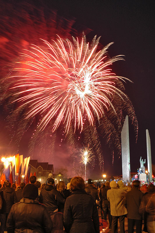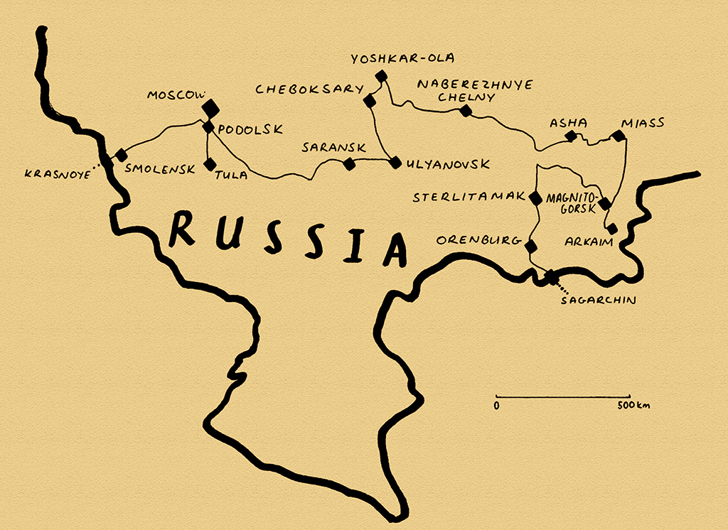 The highlight of my stay in Orenburg is my host Ruslan, a local with whom I immediately strike a lasting friendship. We sit smoking and drinking tea in his kitchen, then go to explore the city, walking down Orenburg’s elegant, tree-lined main boulevard to the Ural River, which is marked on either side by ceremonial posts labelled ‘Europe’ and ‘Asia’. The river is in flood, its surface a huge, glacier-like mass of broken ice and fallen trees, something Ruslan says he has never seen before. Sadly, the famous Orenburg Fortress, from which many of Russia’s expeditions into Central Asia were mounted is long-gone, though there are many charmingly shabby backstreets still to explore. After having another smoke in the ruins of a Tsarist-era electrical supply building, we are driven to Gagarin Park where we happen upon a huge fireworks display to mark the fiftieth anniversary of the first man being launched into space, one of the greatest achievements of the Soviet Union. Although Gagarin hailed from Smolensk region, it was here that he spent much of his time training as an air force pilot. The colours are especially vivid, and I feel it’s a fitting celebratory end to my year spent in and out of Russia.