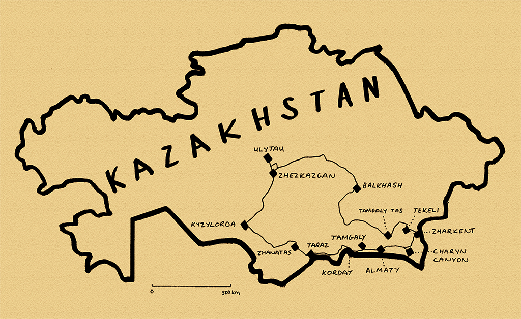 Until the disastrous Soviet program of forced collectivisation in the 1920s, the Kazakhs were an almost entirely nomadic society, who by their very nature left little mark on the land they inhabited. In the month I had just spent in Kazakhstan, making my way from the Russian border in the north-west to the extreme south of the country, I had passed many of the country’s oldest cities, some reduced to lifeless piles of dust, others surviving to this day. All however were the product of the settled societies which stretched south to Persia. Having made a brief side-trip into Kyrgyzstan to renew my visa, I had four more weeks of travel ahead of me in Kazakhstan, during which I would penetrate the very heart of the country, to see the subtle yet fascinating legacy of the successive nomadic nations who have inhabited the steppe. Beyond this, I would head for the far south-east of the country, along the Chinese border, where I would find some of Central Asia’s most haunting landscapes.