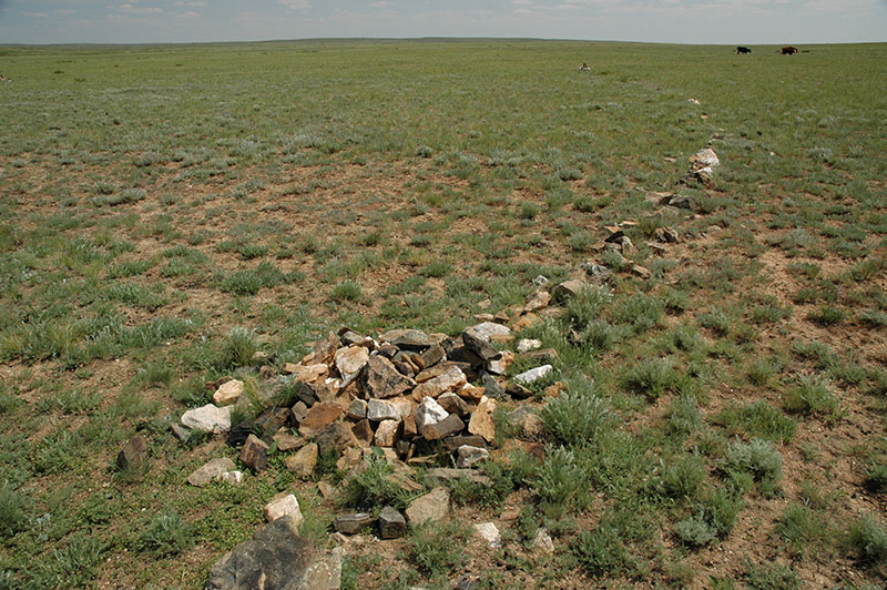North of Zhezkazgan is the region of Ulytau, located centrally both in the country, and in the identity of the Kazakh people. On the main road I pass a tall monument to the unity of Kazakh peoples, signifying both the geographical centre of the country and (conveniently) the point where the three Kazakh zhuzes (clans or hordes) came together to fight their common enemy the Dzungars, who came from China in the eighteenth century. The small, nondescript town of Ulytau itself is set amongst low basalt mountains, something of an oasis in the surrounding dry steppe, with rich green grass and even stands of birch trees. With such an attractive steppe environment it is not surprising that the area is of historical importance, with an abundance of archaeological sites. Out in the steppe just east of town are stone kurgans (barrows), which in each case are part of a larger construction, with two curving lines of stones running roughly parallel away from the kurgan to end in a larger standing stone. It is not clear whether these constructions, known as ‘moustachioed’ kurgans are observatories, grave markers, or ritual constructions.