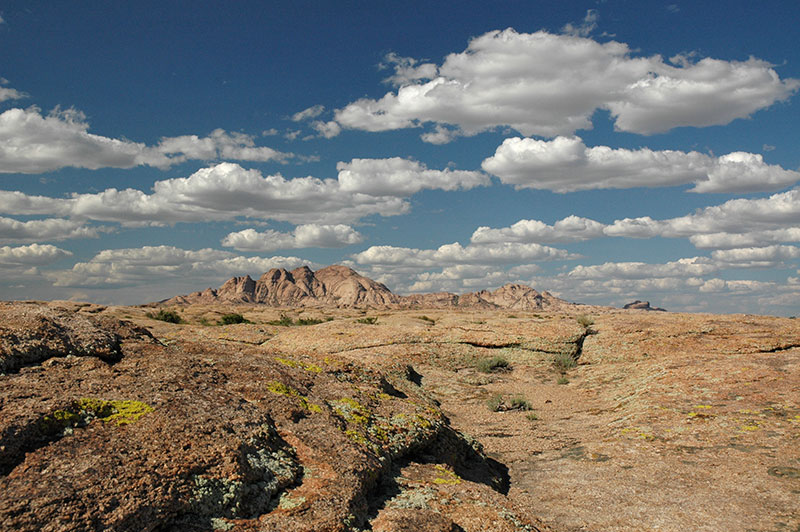 The road out of Kyzylorda leaves behind the near-desert of the Syr Darya Valley, entering country which fades imperceptibly into scrubby steppe dotted with saxauls and wormwood, from which tortoises emerge to make the hazardous crawl across the highway. The asphalt soon runs out, but the track has been recently graded and seldom slows my progress. Off to the west I see a low escarpment of brilliant red-orange sandstone, but other than this there is nothing to catch the eye and the journey becomes mesmerising. After several hours I pass a lonely Kazakh cemetery to my right, on the banks of the Sary Suu River. Not long after this the smokestacks of an industrial city loom on the horizon and large, whitewashed concrete letters at the roadside announce my arrival in the city of Zhezkazgan.
