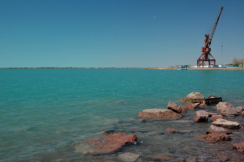 Shortly beyond the town of Atasu, where I stop for dinner, I turn south-west off the main highway into an area of beautiful, table-flat steppe defined by distant low mountain ridges, seemingly good, green pasture yet strangely devoid of population. Continuing the following day, through the isolated town of Akadyr and more marvellously empty terrain, I join the country’s main highway, which connects the new capital Astana with Almaty, its largest city, and is in refreshingly good condition. I stop briefly at the beautiful pink-orange basalt massif of Bektau Ata, whose softly-sculpted, lichen-covered volcanic rocks are dotted with lakes and imbued with legends, before continuing to the city of Balkhash. Lake Balkhash is one of the largest in Asia, a shallow, sickle-shaped smear of bright blue water, saline at its eastern end yet composed of freshwater in its larger western section. The exploitation of nearby copper reserves has overtaken fishing as the main economic activity and Balkhash, the principal lakeside settlement is, like Zhezkazgan, a neat and attractive mining city. Streets of colourful Stalinist buildings (many built by Japanese prisoners of war) run down to the turquoise waters of the lake where a sandy beach is dotted with families, giving the city the air of a friendly, unpretentious seaside resort, albeit with a background of smokestacks and other heavy industry, and highly polluted water.